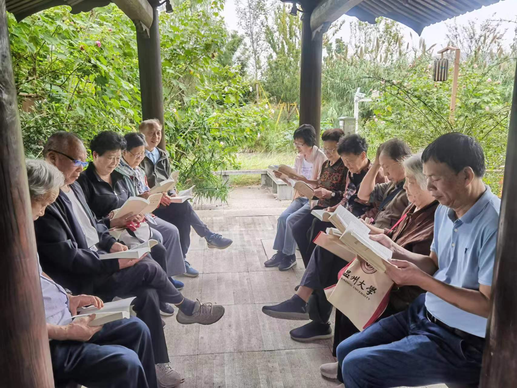 黨員同志們在三垟濕地參觀了“甌江紅黨建人才綜合體”,還在習近平總書記親自種下的大榕樹前集體合影,并在大榕樹下現場開展主題教育理論學習。支部為黨員們準備了《習近平新時代中國特色社會主義思想專題摘編》(以下簡稱《摘編》)一書和學習筆記本。支部書記劉希真傳達了“關于溫州大學離退休干部黨員開展學習貫徹習近平新時代中國特色社會主義思想主題教育的通知”,并領學《摘編》的部分章節,同時組織黨員同志們開展熱烈又充分的學習體會交流。