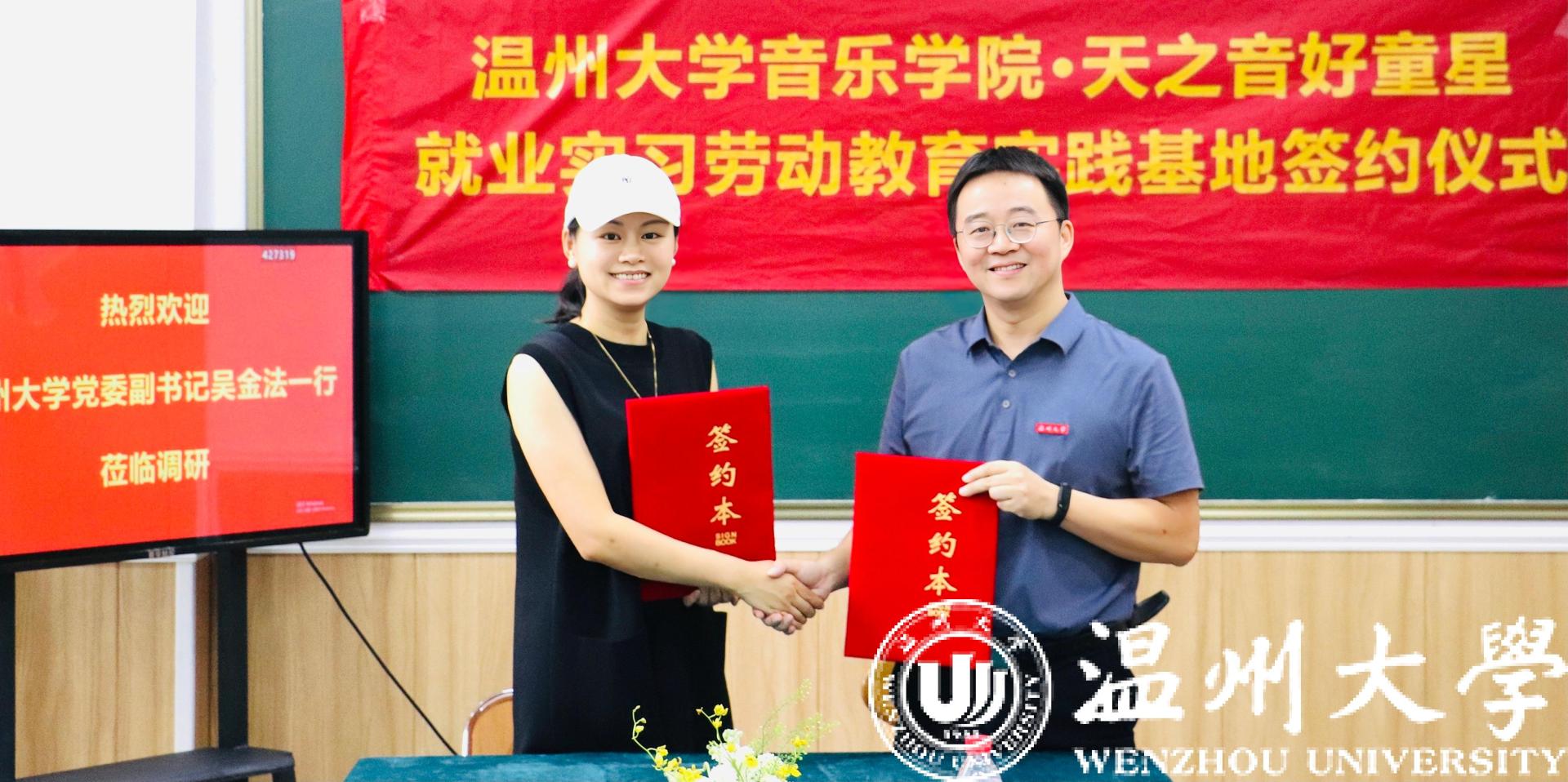 溫州大學音樂學院黨委書記朱啟鑫與天之音好童星藝校校長陳紅紅簽約協議