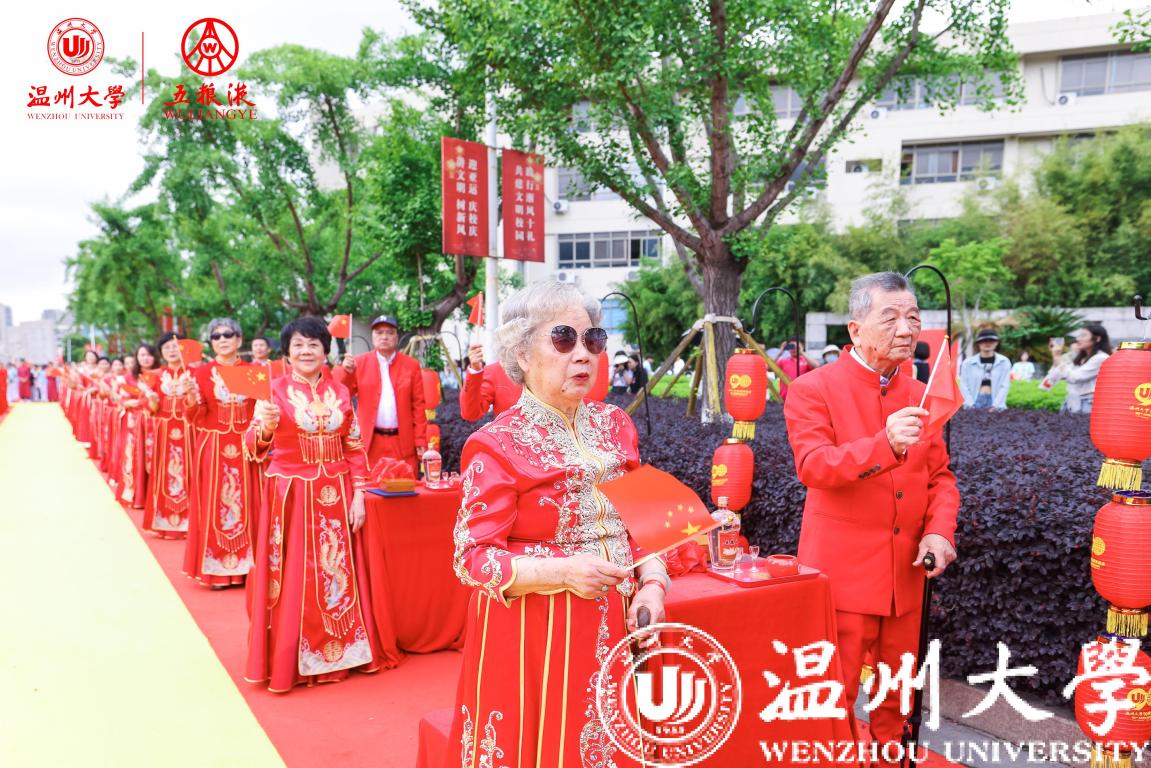 紀(jì)念婚禮以校園風(fēng)光為背景,融入中式婚禮花好月圓的傳統(tǒng)文化意蘊(yùn),結(jié)合學(xué)校的非遺文化底蘊(yùn),生動(dòng)演繹了溫州大學(xué)敢想敢為、銳意創(chuàng)新的浪漫風(fēng)采。校友夫妻身著盛裝,執(zhí)手漫步校園,尋找那些散落在明心湖、圖書(shū)館、教學(xué)樓、實(shí)驗(yàn)室的回憶。他們揮舞繡球,打卡拍照,用最幸福的笑顏和最誠(chéng)摯的祝福,慶祝母校辦學(xué)90周年。這是一段超越年齡的愛(ài)情佳話(huà),更是一次對(duì)母校的生日祝福!