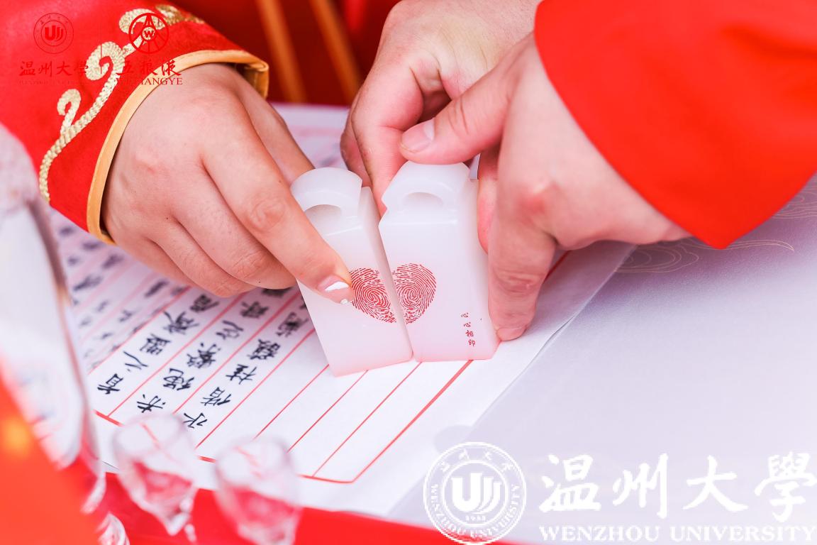 校友伉儷在全體親友、來(lái)賓、師長(zhǎng)、同學(xué)的見(jiàn)證與祝福中行執(zhí)手禮、同牢禮,用定制的玉石印章在紀(jì)念婚書(shū)上烙下自己的幸福印記,許下“執(zhí)子之手,與子偕老”的誓言,溫大人用溫大方式講述最美的愛(ài)情故事。最后,全場(chǎng)揮舞國(guó)旗,齊唱《歌唱祖國(guó)》,用歌聲向祖國(guó)深情告白,訴說(shuō)著溫大人對(duì)祖國(guó)與母校的美好祝福,用青春詮釋愛(ài)國(guó)奮斗精神,用行動(dòng)奏響時(shí)代樂(lè)章。