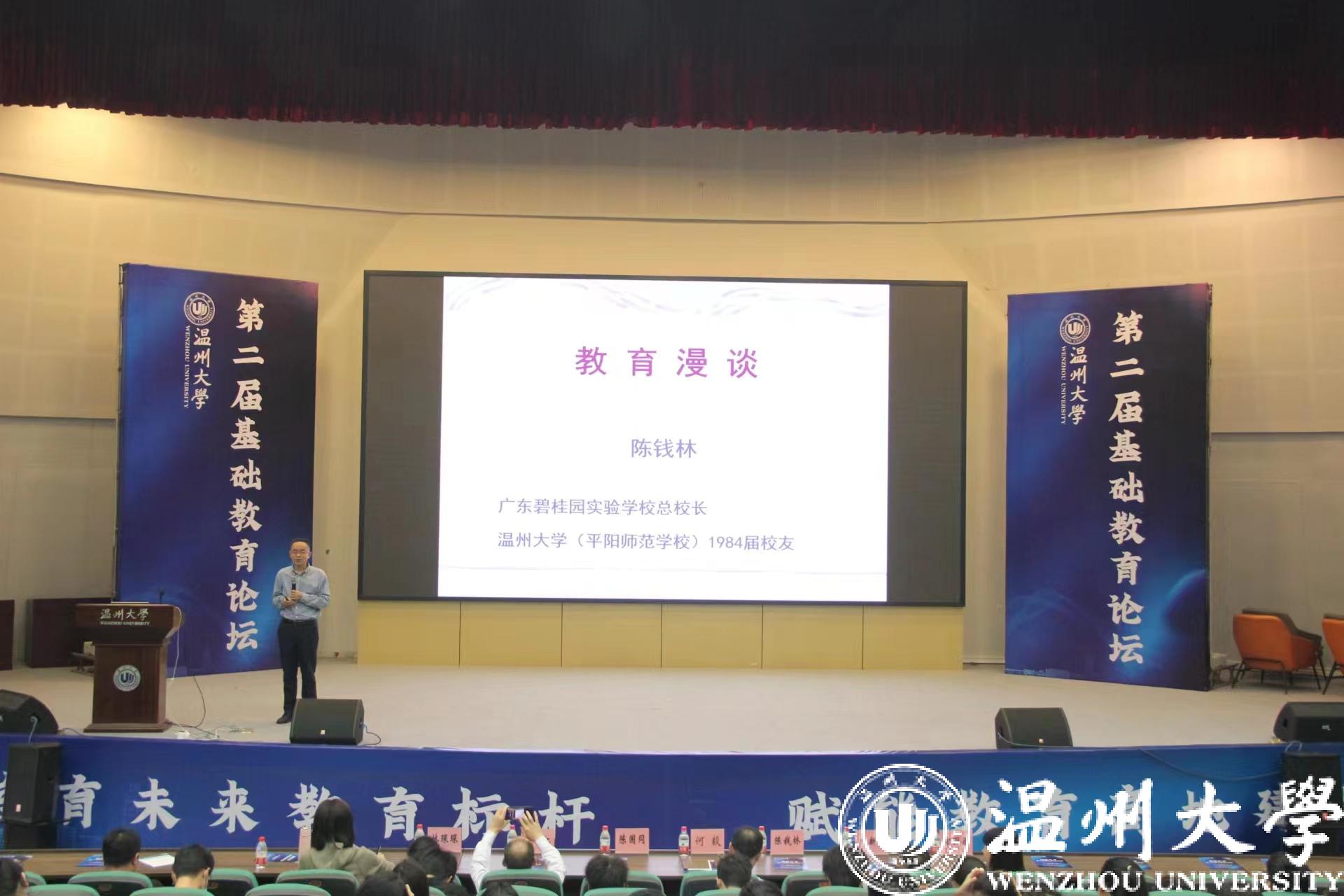 廣東碧桂園教育集團(tuán)區(qū)域總校長(zhǎng)、溫州市首批教育名家、浙江省第八屆督學(xué)、長(zhǎng)三角第七屆最具影響力校長(zhǎng)、溫大教育學(xué)院84屆校友陳錢林作《教育漫談》主旨報(bào)告。