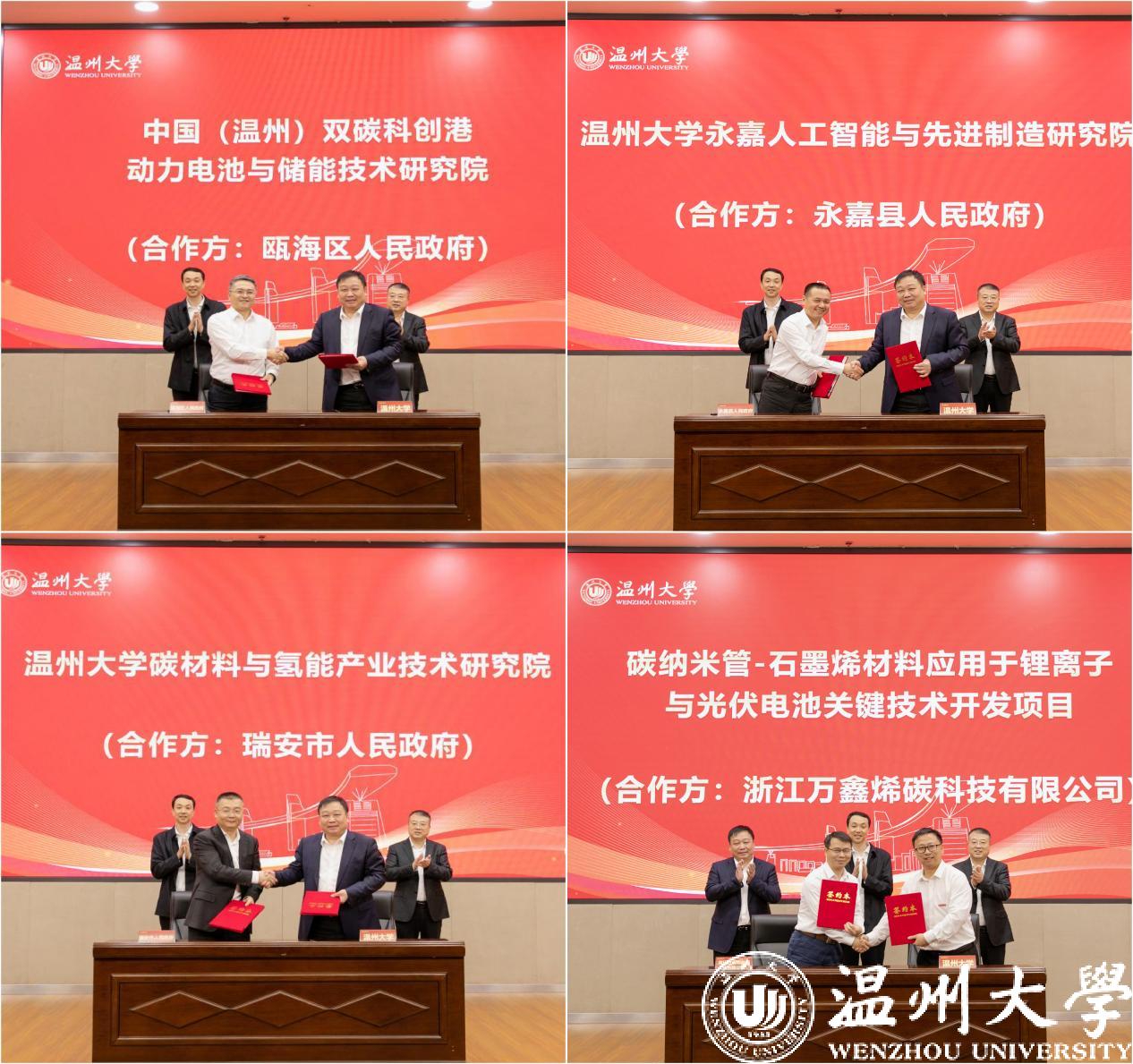 在重大項目集中簽約儀式上,中國(溫州)雙碳科創港動力電池與儲能技術研究院、溫州大學碳材料與氫能產業技術研究院、溫州大學永嘉人工智能與先進制造研究院等5個重大合作項目簽約落地,總計合作經費超2億元。