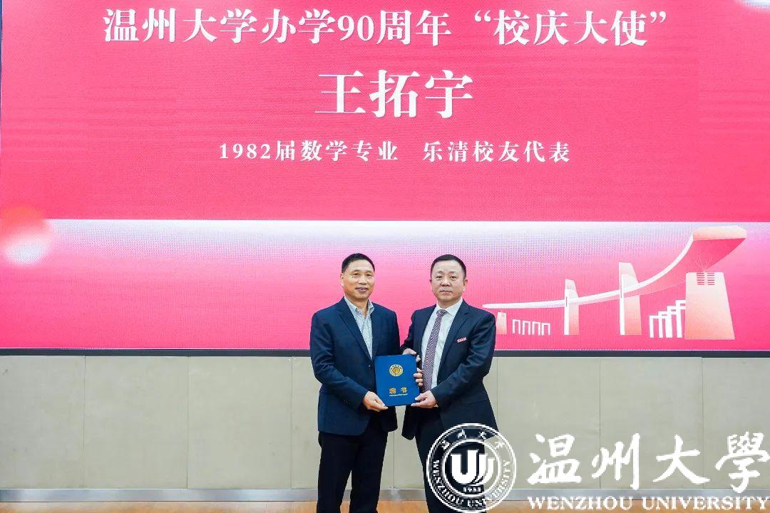 2023年2月18日,王拓宇以溫州大學樂清優(yōu)秀校友代表的身份,參加了溫州大學90周年校慶倒計時90天啟動儀式:“現(xiàn)場氛圍很熱烈!”他感慨地說:“溫州大學現(xiàn)在已經(jīng)發(fā)展成為一所綜合研究型大學,我為自己曾是溫大學子深感自豪!”