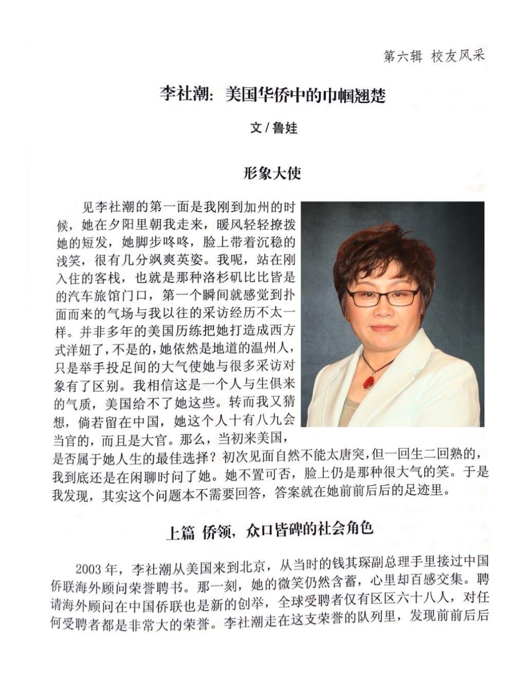 2012年,同為溫大校友、活躍在美國南加州社區的王儉美找到李社潮說,“溫大校友辦希望在北美地區的校友成立校友會,你要幫忙哦!”她一口答應了下來。不久,溫州大學北美校友會(WUAANA)在洛杉磯宣布成立,旅美溫州僑領王儉美出任首屆會長,薛偉副校長率溫州大學代表團前來祝賀。
